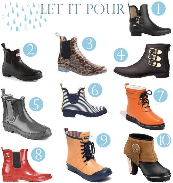 {1} Burberry House Check Detail Rain Boots, $325 {2} Urban Outfitters Hunter Original Two-Tone Chelsea Rain Boot, $125 {3} J.Crew Chelsea Leopard Rain Boots, $60 {4} Zappos Loeffler Randall Rain Fenton, $195 {5} Sperry Starling Rain Boot, $78 {6} Target Women’s Joules® Rain Boot Wellibob, $59.99 {7} Nordstrom Ilse Jacobsen Hornbæk ‘Rub’ Boot, $169.95 {8} Macy’s MICHAEL Michael Kors MK Charm Rain Booties, $89 {9} Tommy Hilfiger Colorblock Rain & Snow Boot, $79 {10} Sorel Women’s Medina II™ Boot, $225